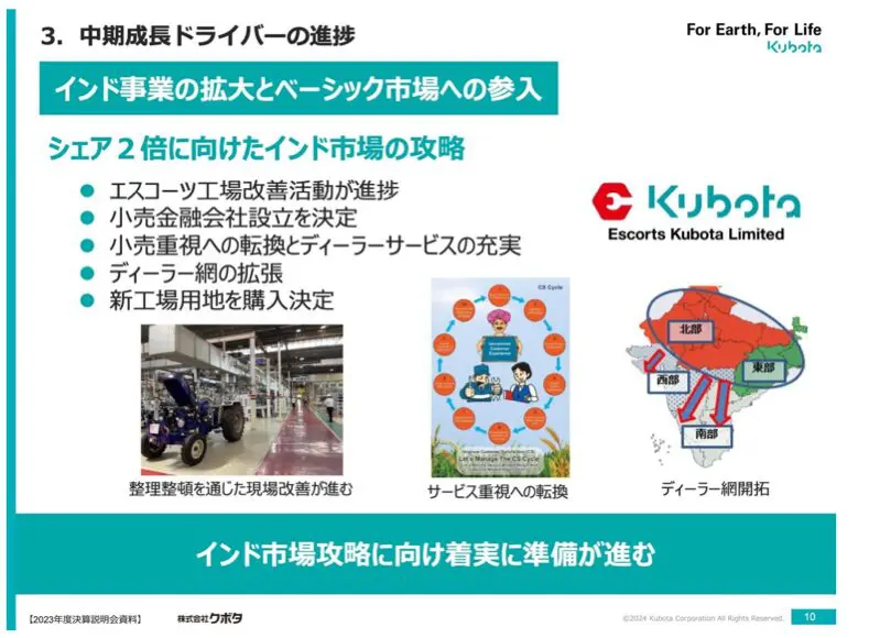 ベーシック農業とは低価格帯のトラクタの開発・販売です。その布石が2021年に行われたインドの農機大手、エスコーツ社の買収です。同社はトラクターの販売台数で世界最大のインド市場の主要なトラクターメーカーです。エスコーツ社の買収によって、クボタのインドにおけるシェアは2%から13%まで拡大しました。インド市場のシェアトップは地元企業のマヒンドラ&マヒンドラ(インド内シェア40%、世界シェア4位)です。クボタは2030年までに現在のシェアを24%、現在から約倍増させる目標があります。インドではトラクターを農作業だけでなく日常の移動や荷物の運搬など、さまざまな用途に使っており、機能を絞りながらも価格を抑え耐久性の高いトラクターの需要があります。