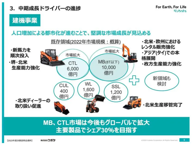 この競争環境の中、クボタは主要製品でシェア30%を目指しています。現状は「ミニバックホー」と呼ばれる油圧ショベルや、土木建設や除雪など複数の作業が可能な「コンパクトトラックローダ」など、比較的小型の建機に強みがあります。アメリカ市場開拓と同様に、コマツやキャタピラーが得意とする鉱山などで使われるような大型の建設機械ではなく、クボタが得意な小さな建設機械をいかに売り込めるか?