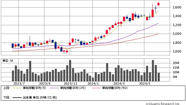 住友電工の株価はこの1年で大きく上がっていて、特に2024年に入ってからの上昇率はすさまじいです。