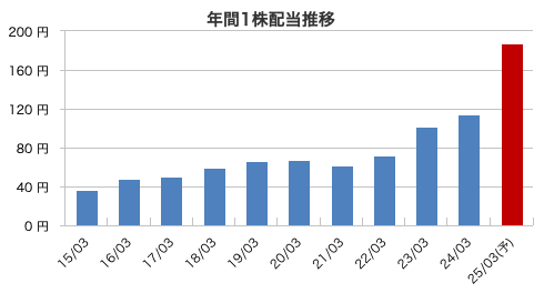 なお、25年3月期の1株あたり配当金は前年比+74円(前年比約65%増)の188円です。うち30円分は創立50周年の記念配当が含まれており、予想配当性向は120%です。しかしこの記念配当を考慮しない場合、配当性向が約100%となる見込みです。配当方針に基づいた積極的な株主還元です。