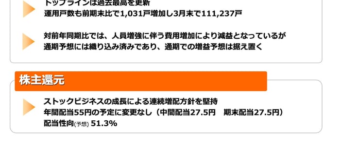 株主還元については、ストックビジネスの成長による連続増配方針を堅持することから変わりなく、年間配当55円の予定にも変更はありません。これは過去最高の配当で、配当性向51.3パーセントという高配当を維持します。