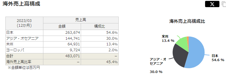 海外売上高比率は特にアジアが多く、中国はやはりそれなりの売上比率を占めています。