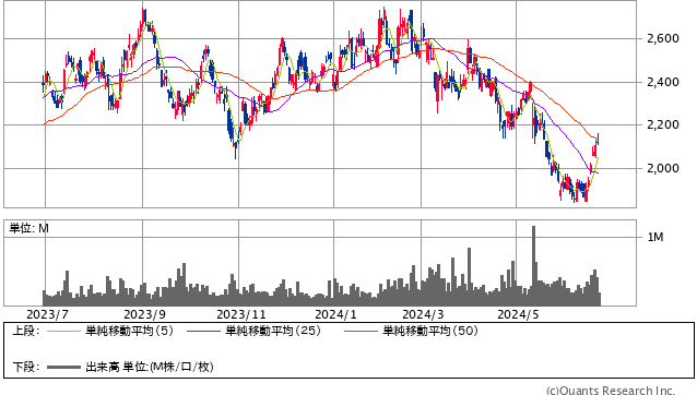 株価は、6月7日に年初来安値を更新し、そこから切り返して今週は長めの陽線を描いている。13週移動平均線をクリアに上抜けてくると、あらためて戻り歩調が強まると見られる。