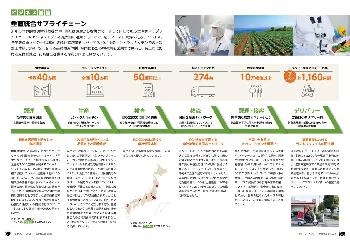 現在は、原材料の調達から消費者に料理を届けるまでの効率性を重視した経営に舵を切っているため、新規出店の拡大戦略も適切にコントロールできれば成長に寄与する可能性があります。 資料を見る限りは、原材料の調達から 消費者に料理を届けるまでの様々なところで、 効率性を考え、それをコントロールしている様子がわかります。