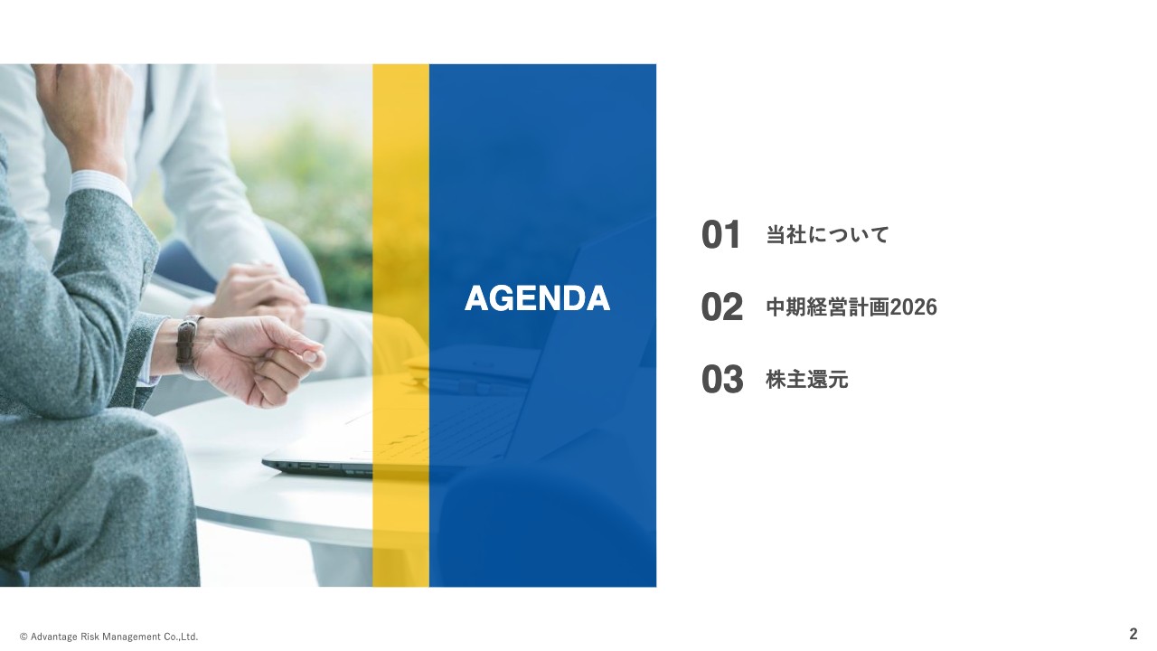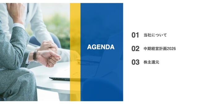本日は私から、会社概要、先日発表した「中期経営計画2026」、株主還元の3点についてご説明します。よろしくお願いします。