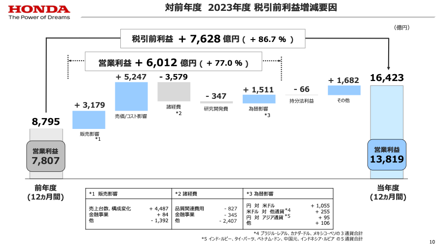 販売影響=販売台数の増加と言えますが、過去2〜3年の半導体不足で後ろ倒しになっていた自動車の供給が、正常化に近づいたことが関係しているでしょう。コスト影響については、主に四輪事業において生産体制の見直しやモデル数の削減を行い、固定費額を2018年比で10%以上削減していることが関係しています。