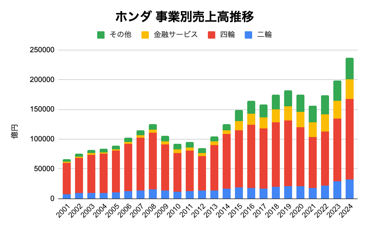 事業別売上高推移を見ると、四輪が売上の大半を占めていることがわかります。二輪に比べて単価が高いことが影響していると考えられます。