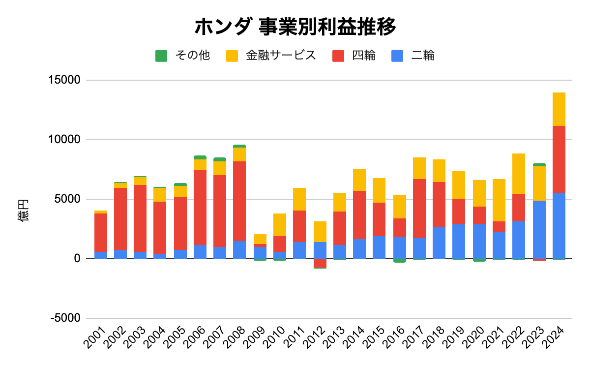 一方で、利益を見ると二輪車の貢献度が高いことがわかります。四輪事業は目先好調ですが、二輪事業に比べると安定感に欠けています。特にリーマンショックがあった2008年ごろは大変厳しい状態でした。2023年も半導体不足の影響や中国の景気後退の流れを受けて赤字となりました。