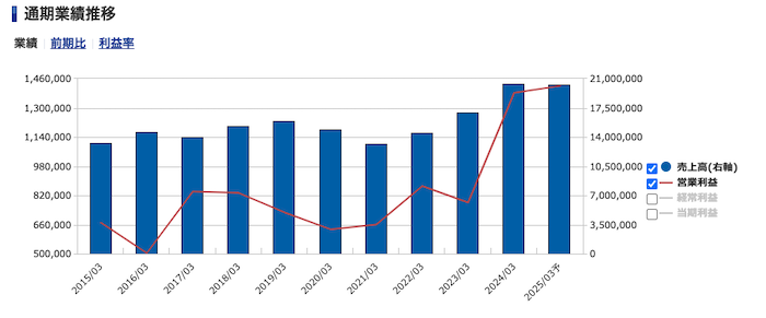 まずは業績を見てみます。中長期的に売上・利益ともに順調に成長しています。