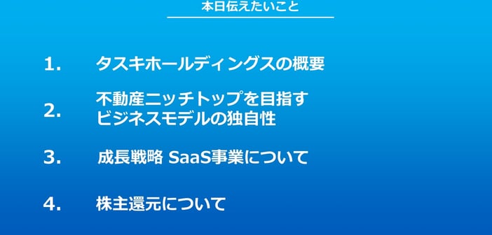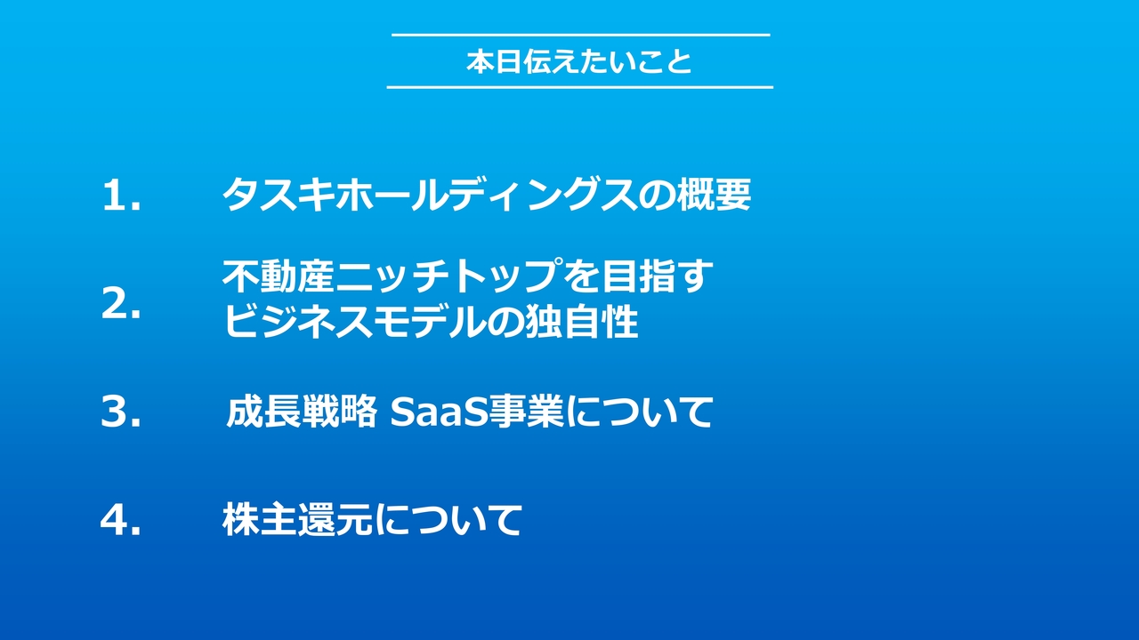 柏村雄氏(以下、柏村):タスキホールディングス代表取締役社長の柏村です。よろしくお願いします。本日お伝えしたいことは、スライドに記載の4点です。はじめに、当社グループの会社概要についてご説明します。