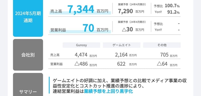 サマリーとして、ゲームエイトの好調に加えて、メディア事業の収益性安定化とコストカットが進捗した結果、連結営業利益が業績予想を上回って黒字化しました。