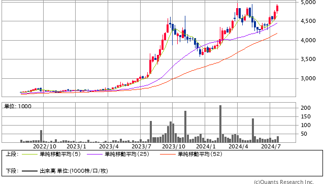 株価は目を見張る好パフォーマンス。4月につけた上場来高値=4,970円に顔合わせする強い動きとなっている。 ※2024年6月中に初月無料の定期購読手続きを完了すると、以下の号がすぐに届きます。