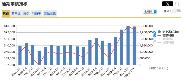 直近の24年3月期も主に資源価格高騰による鉱山機械需要増の影響で過去最高の売上(3兆8,651億円)と営業利益(6,071億円)を達成しました。このように業績の変動はありながらも、中長期的には株価は上昇しています。