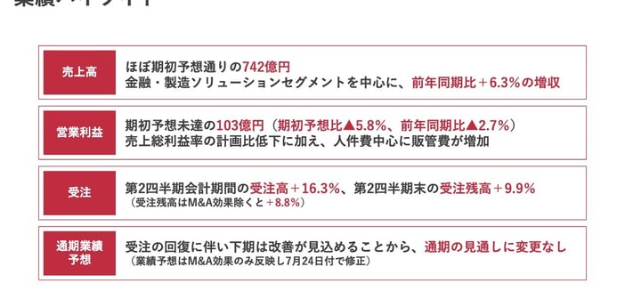 業績ハイライトは4点です。売上高は、ほぼ期初予想どおりの742億円となりました。金融ソリューションセグメント、製造ソリューションセグメントを中心に、前年同期比6.3パーセントの増収です。