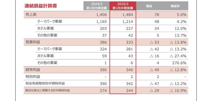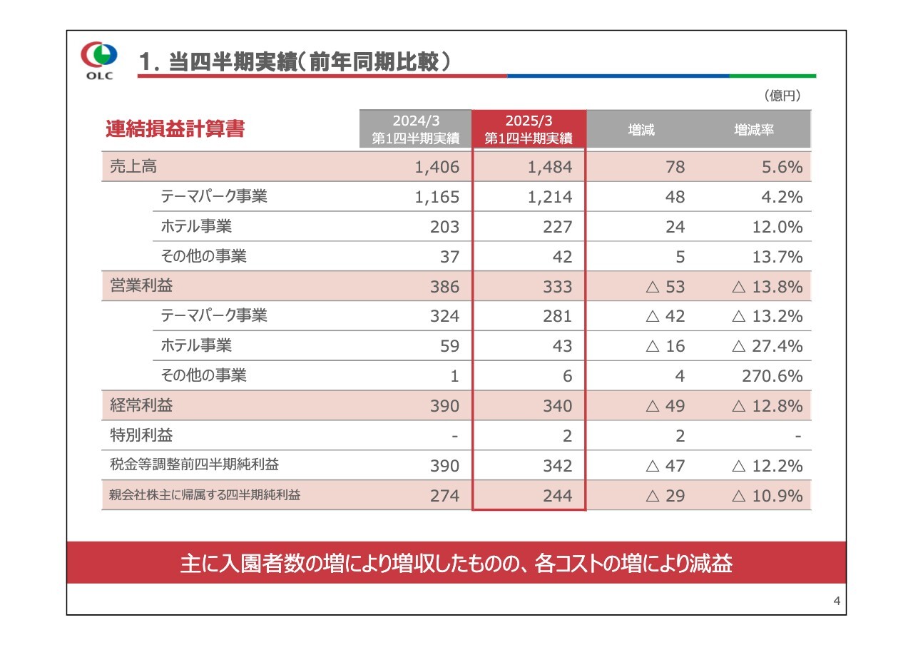 まず、2025年3月期第1四半期の決算概要についてご説明します。当四半期実績はスライドのとおりです。前年同期と比較して、主にテーマパーク事業の入園者数の増加により増収となったものの、各コストの増加により減益となりました。