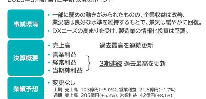 今回の決算のポイントです。事業環境として、日本経済の状況は企業収益が改善し、業況感は良好な水準を維持しており、景気は緩やかに回復しています。その中で、製造業の情報化投資は変わらず堅調と考えています。