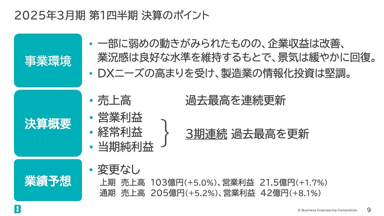 別納成明氏(以下、別納):ビジネスエンジニアリング、代表取締役専務取締役CFOの別納です。2025年3月期第1四半期決算の内容についてご説明します。まずは概要からお話しします。