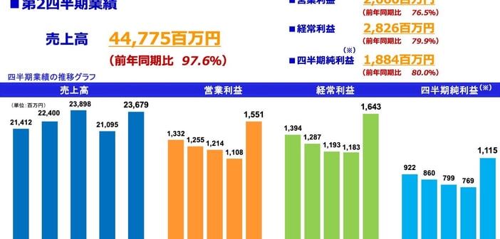 まず、連結の決算概要について、ポイントをご説明します。スライドは、四半期の業績推移です。第2四半期は、売上高が447億7,500万円、営業利益が26億6,000万円、経常利益が28億2,600万円、四半期純利益は18億8,400万円となっています。