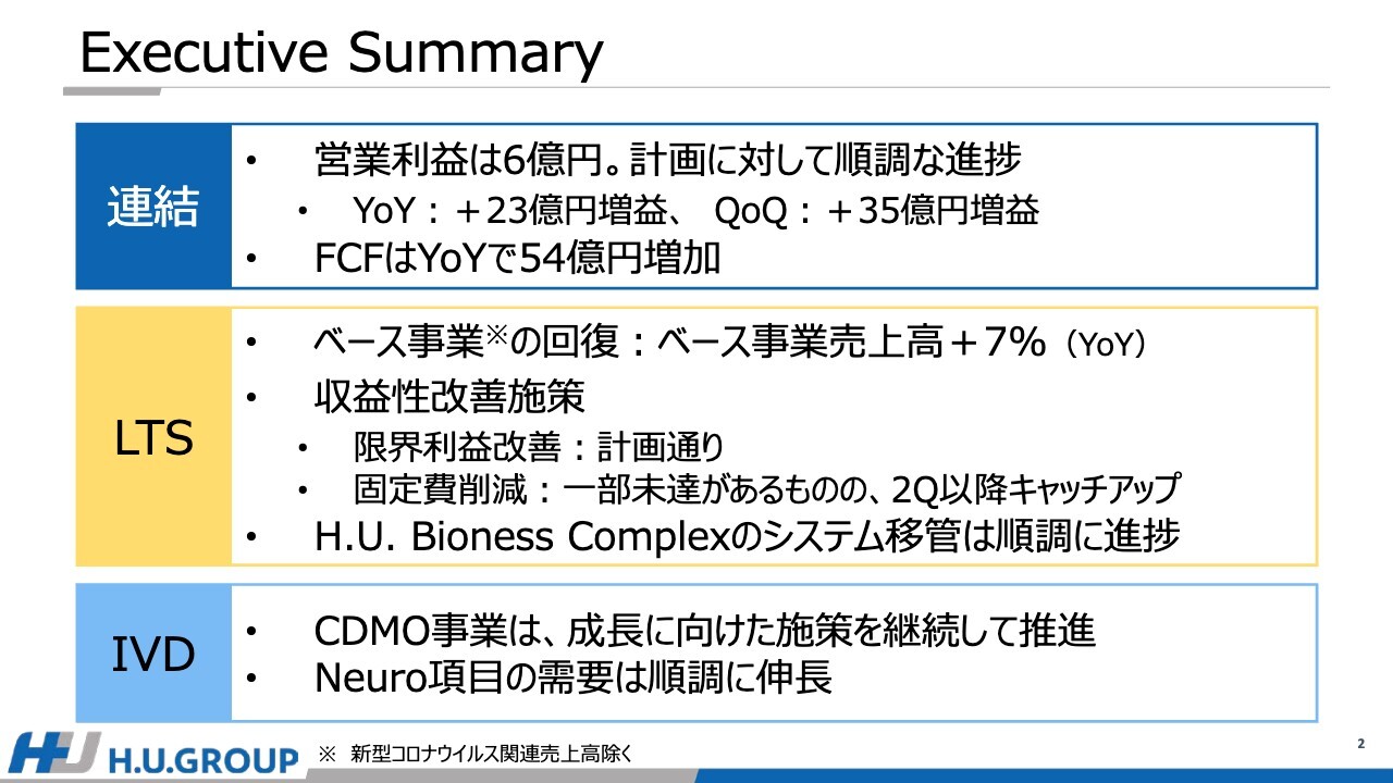 今期の計画の中心となる収益性改善施策については、限界利益の改善は計画どおりに進んでいます。固定費削減に関しては、一部未達がありますが、今後キャッチアップさせていきます。H.U. Bioness Complexのシステム移管に関しても順調に進捗しています。