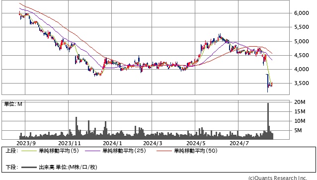 過去1年間の資生堂の株価推移を見ると、その下落幅の大きさに驚かされます。具体的には、1年前と比較して46.77%もの下落を記録し、2024年8月15日時点で3,393円まで急落しています。この下落率は、同業他社や日経平均と比較しても顕著であり、市場が資生堂の将来性に対して強い懸念を抱いていることを如実に示しています。