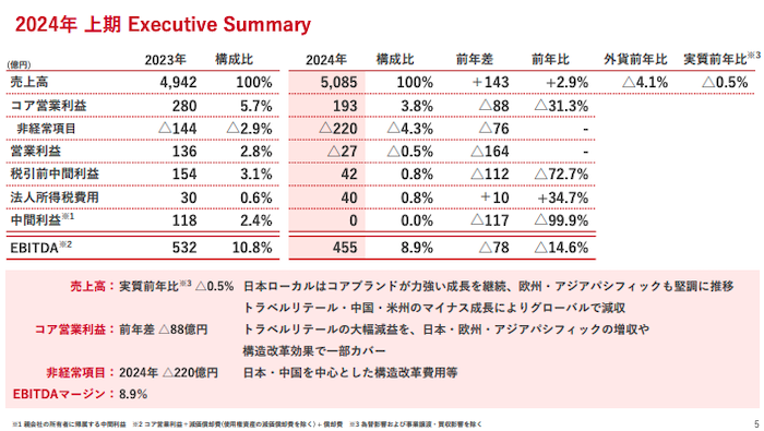注目すべきは、コア営業利益率の低下です。2023年上期の5.7%から2024年上期は3.8%へと大幅に低下しており、収益性の悪化が顕著です。この利益率の低下は、後述する様々な要因が複合的に影響した結果といえます。