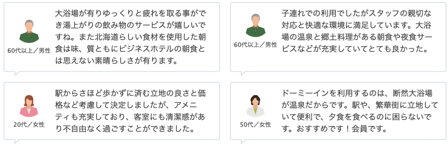 オリコンに寄せられた「ドーミーイン 利用者の声」からも、サービスの質に満足している様子がわかります。