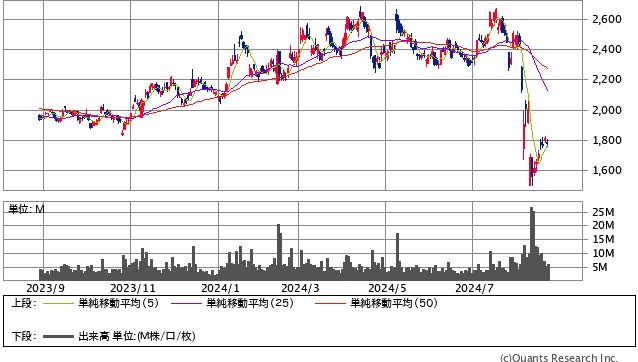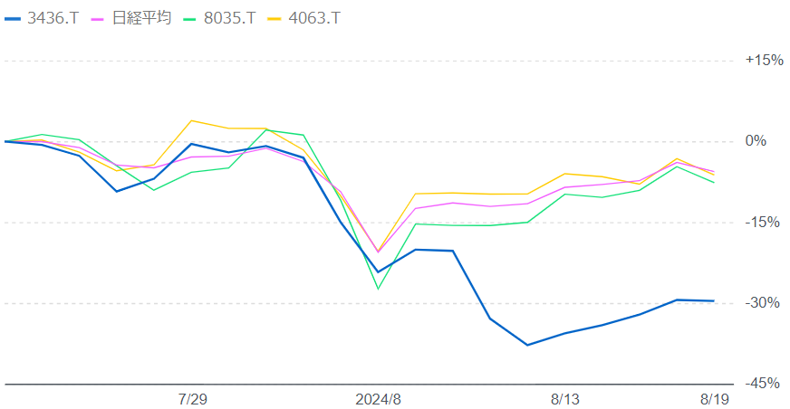 2024年8月5日、日本株市場全体が大きく下落しました。この日、SUMCOの株価も大幅に下落しましたが、その後の回復が他の半導体関連銘柄と比べて遅れています。例えば、東京エレクトロン<8035>の株価は8月5日の下落後、徐々に回復傾向にありますが、SUMCOの株価は依然として低迷しています。