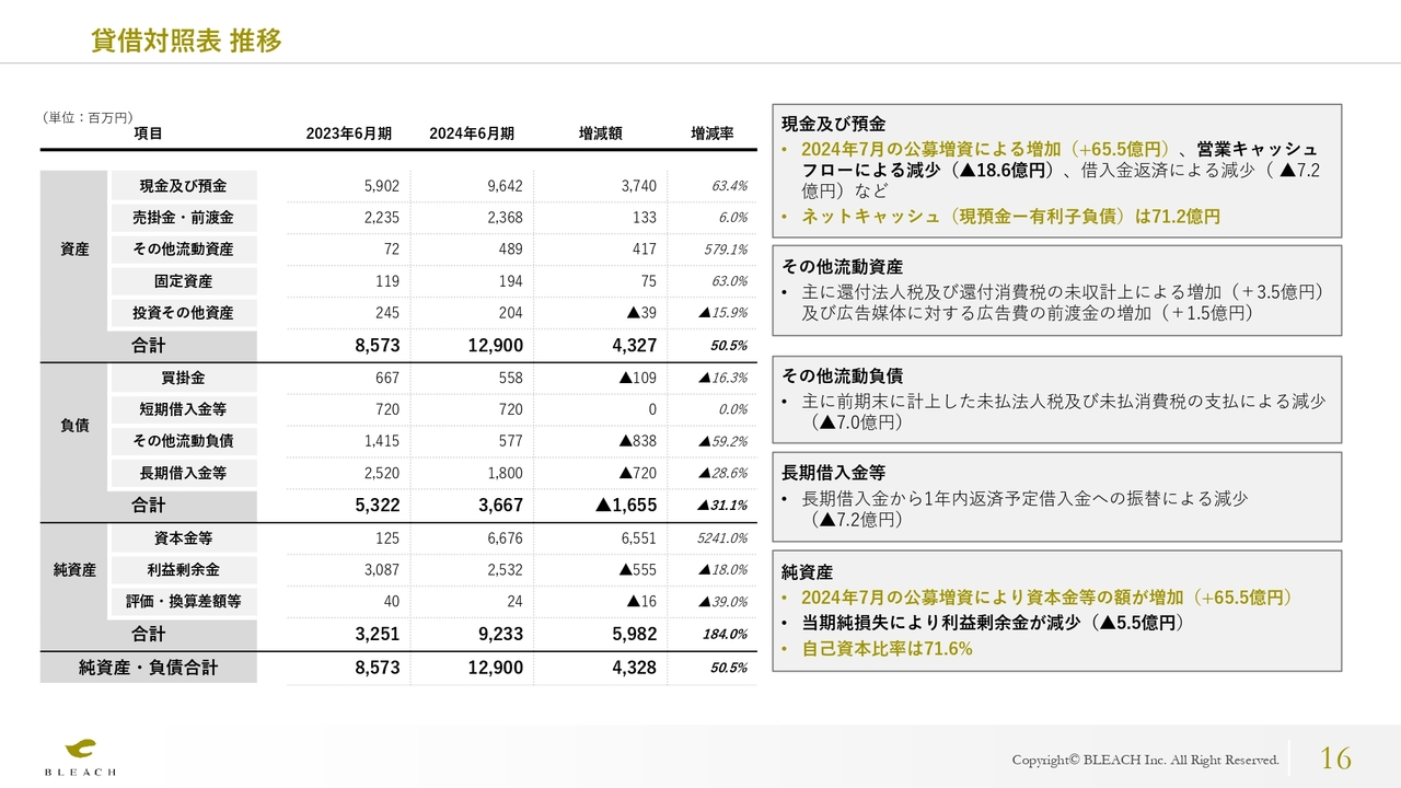 貸借対照表の推移です。現金及び預金は、2023年7月の上場時に行った公募増資により65億5,000万円が増加した一方で、営業キャッシュフローのマイナスにより18億6,000万円減少し、さらに借入金の返済により7億2,000万円減少しました。
