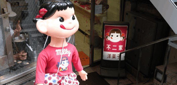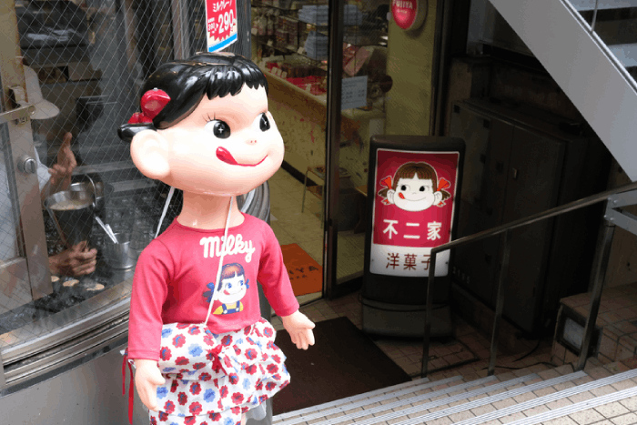 イメージキャラクターのペコちゃんが生まれたのは戦後の1950年のことである。63年からは洋菓子店のフランチャイズ化を開始し、都市部の駅前を中心として全国に店を構えた。