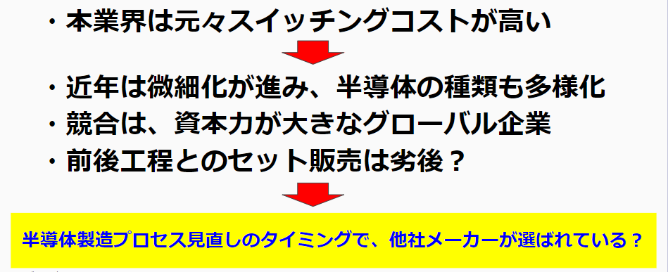 基本的にはスイッチングコストが高い業界だと思っていたのですが、半導体の種類が多様化して、新しい種類の半導体を作ろうとした時に、効率的な製造方法をゼロベースで考える機会が増えてきたのではないかと思っています。その時に、競合である東京エレクトロンやラムリサーチは資本力が桁違いに大きく、研究開発に投資して新しい技術を持っていたり、洗浄装置以外の製品も強いので他の製造装置とセットで受け持ったりしているのではないかと思います。また、SEMESはSamsungのおひざ元なので、Samsungが作る半導体にはSEMESの洗浄装置が採用されるということもあります。