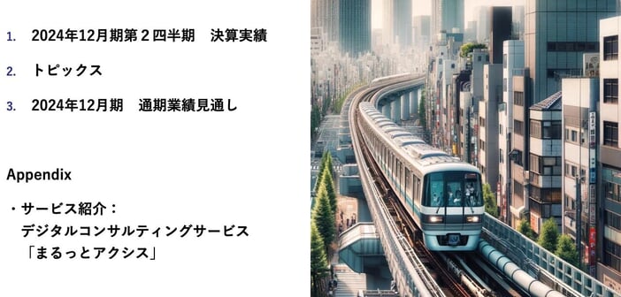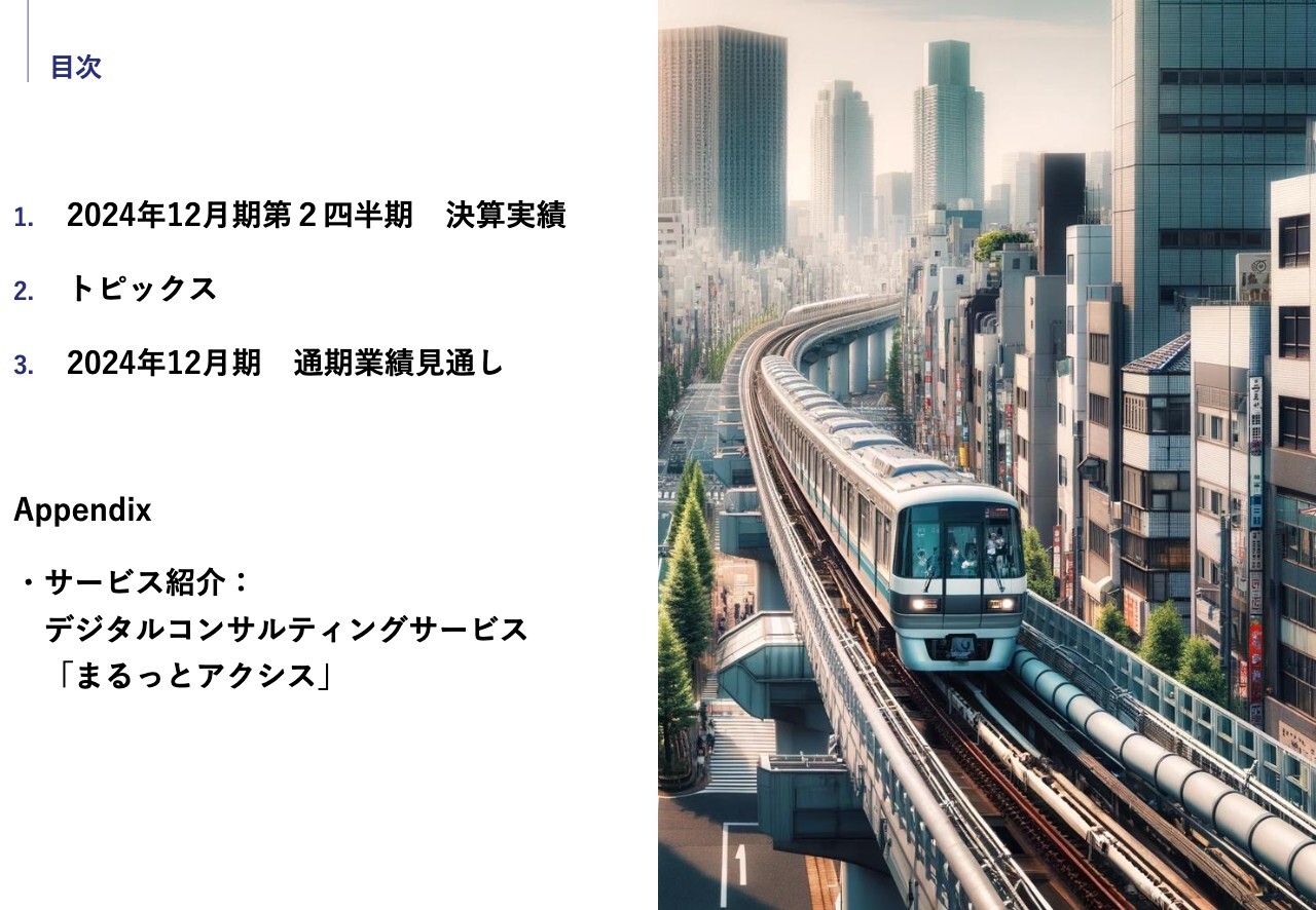 最初に、2024年12月期第2四半期決算の実績を発表し、続いてこの四半期におけるトピックス、2024年12月期の通期業績見通しについてご説明します。最後に当社のデジタルコンサルティングサービス「まるっとアクシス」をご紹介します。