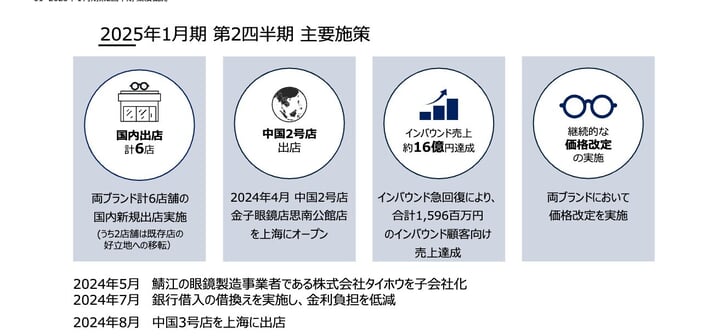 スライドの下部に記載したとおり、5月に鯖江の眼鏡製造事業者である株式会社タイホウを買収し子会社化しています。そして7月末に既存の借入、これは大半が5年前のファンド出資時のLBOローンになりますが、こちらの借換えを実施し、コーポレートローンへ切り替えています。これにより、将来的には金利負担の低減が図れると思っています。