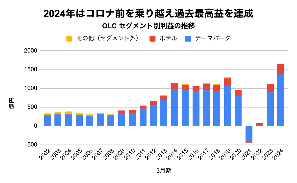 事業ごとの利益の推移を見てみると、最大の収益源はやはりテーマパーク事業です。