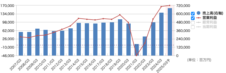 売上高6,184億円、営業利益1,654億円ともに24年3月期に過去最高を達成。25年3月期予想は売上高6,847億円、営業利益1,700億円と過去最高を更新する見込みです。