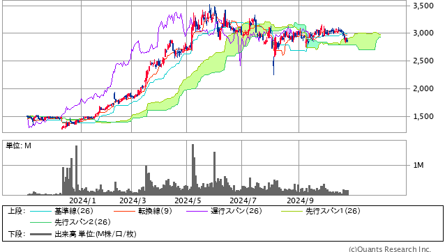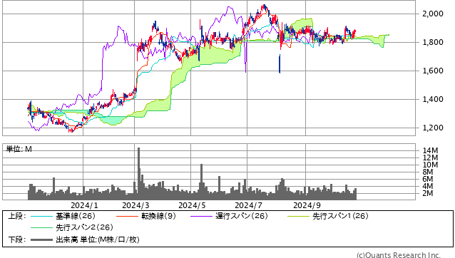 株価は9月3日に年初来高値を更新し、その後は調整局面入りしているが、足元で一目均衡表の日足「雲」上限までの戻りを見ており、この日足「雲」を上抜けるとリバウンドの動きが強まるものと思われる。