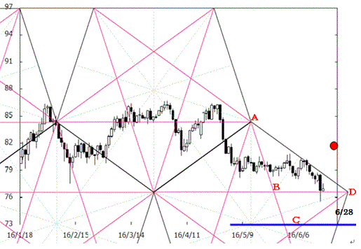 下落エネルギーの強い相場が続いている。下値のメドは73円前後を考えたい。反発上昇エネルギーの強い相場への転換のポイントは赤丸水準の82円を終値で超えることである。