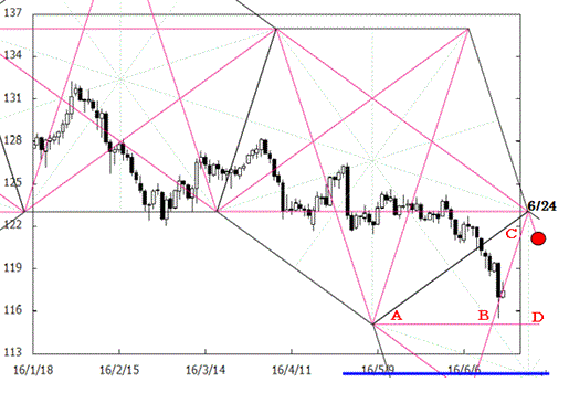 下落エネルギーの強い相場が続いている。EU離脱の場合の下値のメドは終値として111円50銭前後を考えたい。反発上昇エネルギーの強い相場になるには赤丸水準の121円50銭を終値で超えることである。更に本格的上昇相場に移行するには128円を終値で超えることが必要となる。