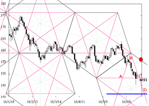 先週のレポートでは、B点に注目した。ペンタゴンのど真ん中の時間帯にあたるB点を通過することで新しい流れが出るのか否かがポイントになったからだ。しかし、実際には下げ止まることなく、軟調な展開が加速し、ACラインに到達した。次の注目日は6月21日前後である。