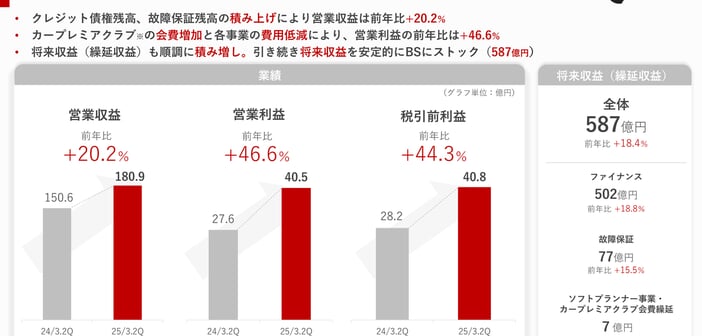 決算概要です。冒頭のハイライトでご説明したとおり、クレジット債権残高、故障保証残高をしっかりと積み上げることができたため、営業収益は180億円を超え、前年比20パーセント超えとなっています。