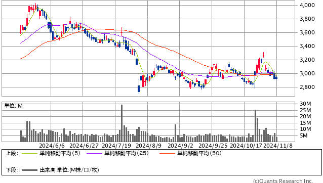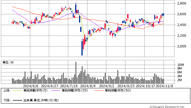 25年3月期は、売上高が前期比6.5%増の2兆5,000億円、営業利益は同48.3%増の2,400億円、純利益は同48.6%増の1,850億円と過去最高を更新する見通し。株価は一目均衡表の週足「雲」の下方で底練りの展開を続けており、当面は週足「雲」上抜けのタイミングを見計らいたい。