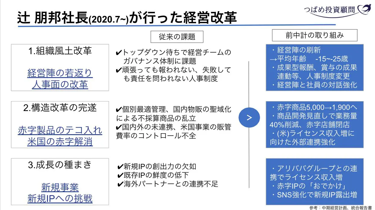 1.では経営陣の若返りと人事制度の整備を行いました。特に驚くべきことは取締役会の平均年齢を65歳から40歳前後まで引き下げたことです。サンリオの主要顧客は若い女性ですが、少しでもその感性に近づけるために、女性の取締役を抜擢するなど組織風土改革に取り組みました。