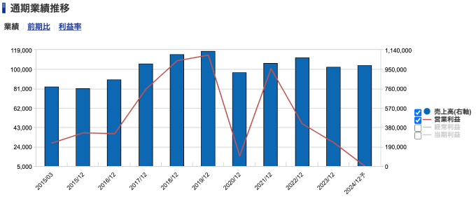 2016~2019年は好調で、利益が倍以上に伸びていましたが、2020年のコロナで大きく落ち込み、その後復活しつつあったのですがそこからまた落ちてしまい赤字寸前にまでなっています。