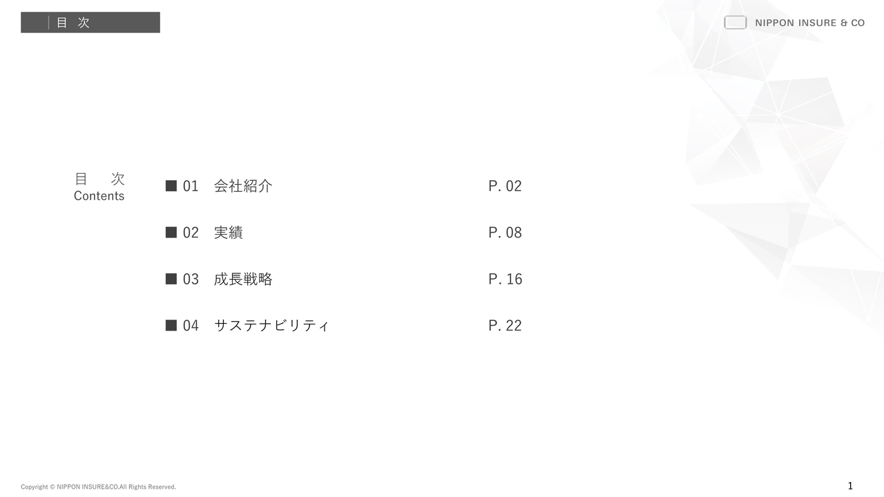 坂本真也氏:本日はご視聴いただき、誠にありがとうございます。ニッポンインシュア株式会社代表取締役社長の坂本です。