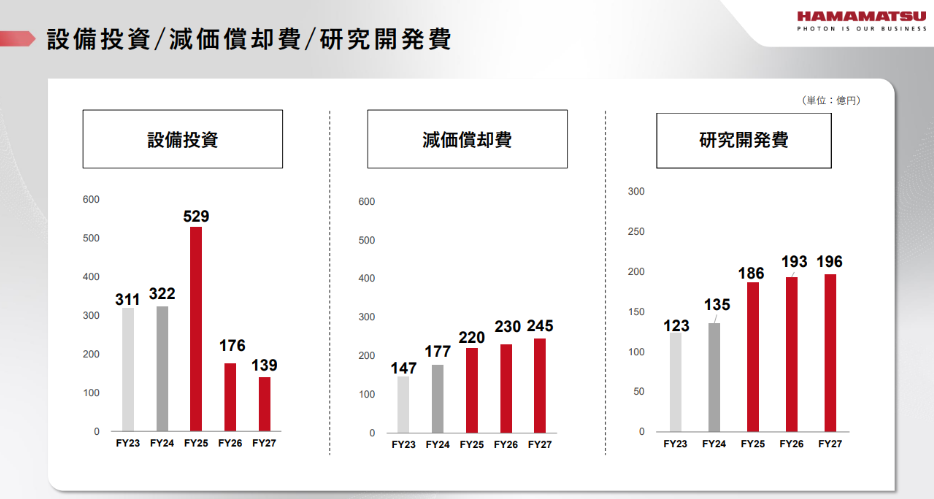 新しい工場・研究棟を建てる設備投資をするということで、設備投資をするとその先数年から十数年間費用として計上される(減価償却費)わけですが、2024~2025年で50億円弱も減価償却費が増えてしまうということです。さらに、浜松ホトニクスは光の技術を常に研究開発して最先端の技術を追い求めていて、その研究開発費も2024~2025年で50億円増えるとなっています。市場の環境が良くない中で先行投資を重ねている状態で、これが利益を圧迫する最大の要因だと思います。