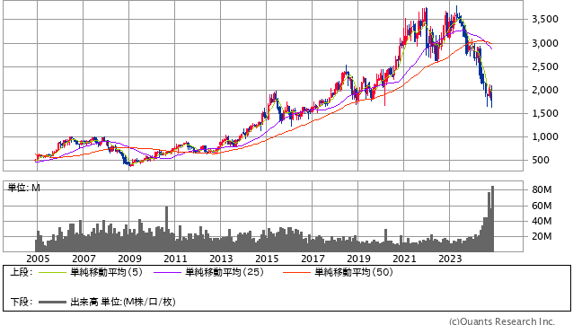 株価を調子よく伸ばしてきて、特に2021年から2022年にかけて大きく上がり、その後も高い水準で推移してきたのですが、この1年くらいで急に大きく下落している状況です。
