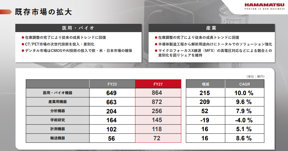 前期の実績の売上高では、医用・バイオ機器が649億円で全体の35%程度、産業用機器も同じくらいとなっていますが、2027年には比率的には大きく変わらないですがこの2つの分野を年率10%くらいのペースで伸ばしていくという計画を立てています。