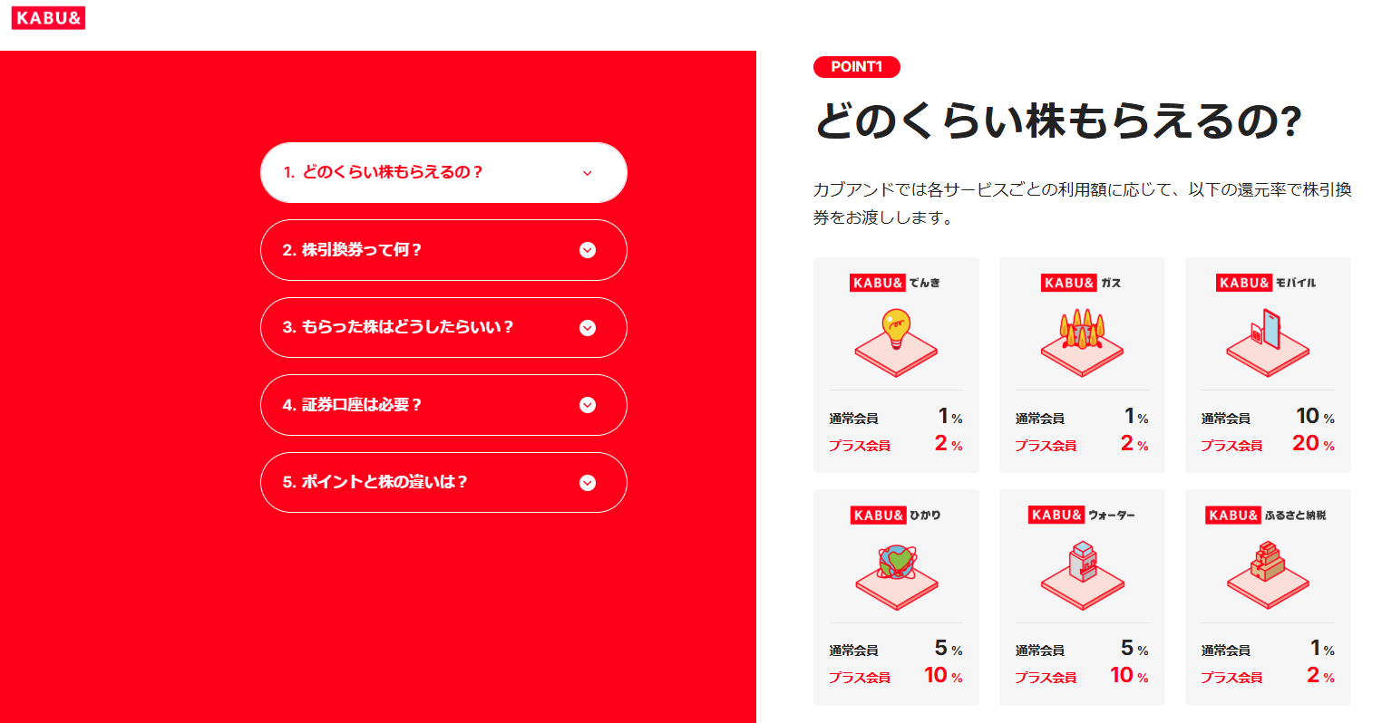 具体的なサービスとしては現時点で、電気、ガス、モバイル(携帯電話)、光、ウォーター(サーバー)、ふるさと納税の6つがあり、加入するとポイントのような形で株の引換券が貰えるという話です。