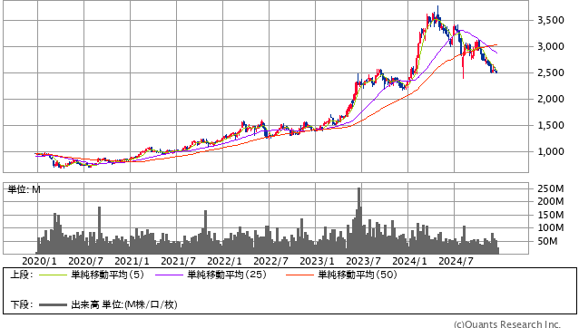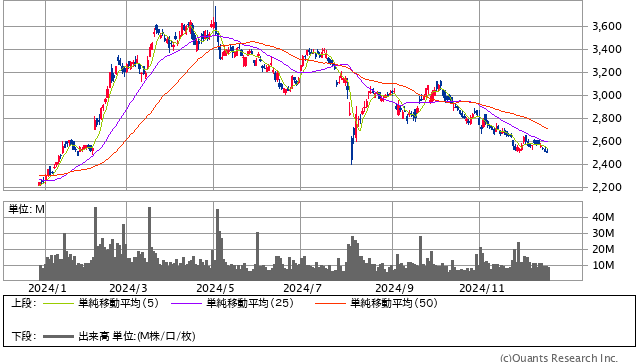 直近6ヶ月で約25%下落していて、年初来からはまだプラスとなっていますが、4月頃のピークには3,600円くらいあったものが2,500円くらいになっています。