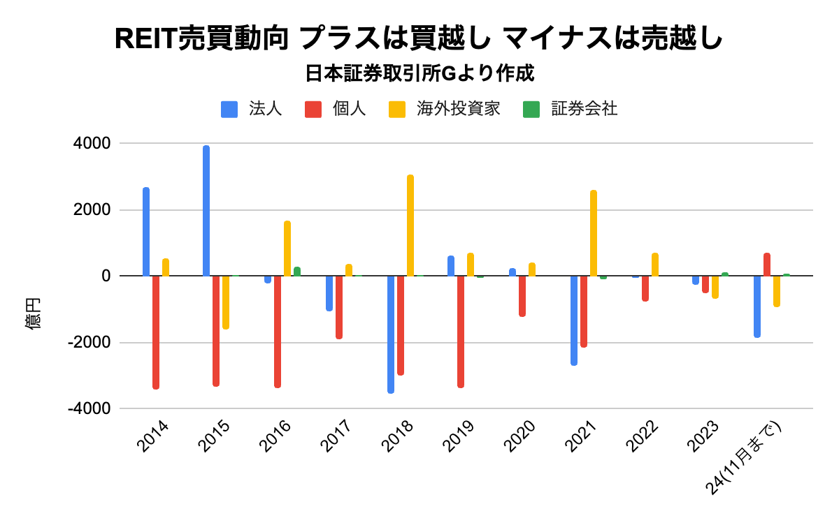 REIT指数の下落を理解する上で、投資家の需給動向も重要な視点です。