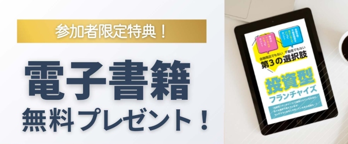 今回、個別相談会に参加された方には特別に「投資型フランチャイズ」のイロハがわかる電子書籍を無料でプレゼント!ぜひこの機会にライフプランを見直し、老後の不安を解消しながら充実した人生を送るための第一歩として、無料ポートフォリオ相談に参加してみませんか?